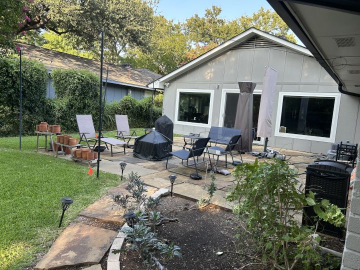 We live in a lovely one-story home in Texas with 3 bedrooms and 2 bathrooms. We also have an office/library and a small room adjacent to it for our kitties, Rosie and Daisy. The living room, dining area, kitchen, and gym space are all very open with big windows. We have cozy furniture, and we spend many nights watching TV with the cats on our laps. We have a lot of cat toys and cat trees everywhere for our kitties, including play areas. Our decorations focus on family: we have a “family crest” that we imagined together, a map of our adventures, family pictures, and beautiful photography taken by Nicole’s dad. Our small front yard has an herb garden. Our back yard is fenced, has a patio, soft grass for play, and flower beds for digging in the dirt.